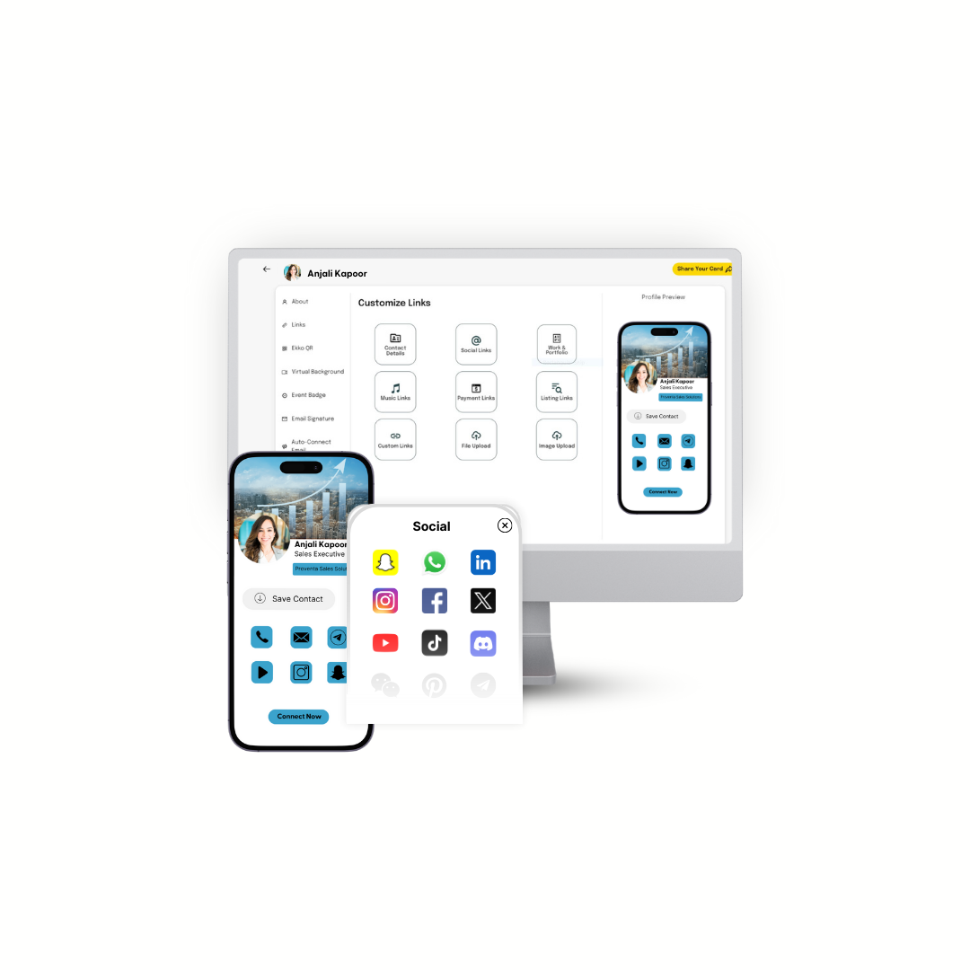At Ekko, we understand the fast-paced, dynamic nature of sales. That's why we provide digital business cards that do more than just share contact details—they create an immersive experience for potential clients. Our cards include features like scannable QR codes, allowing you to instantly share your business profile, portfolio, social links, and more—all with a single scan.